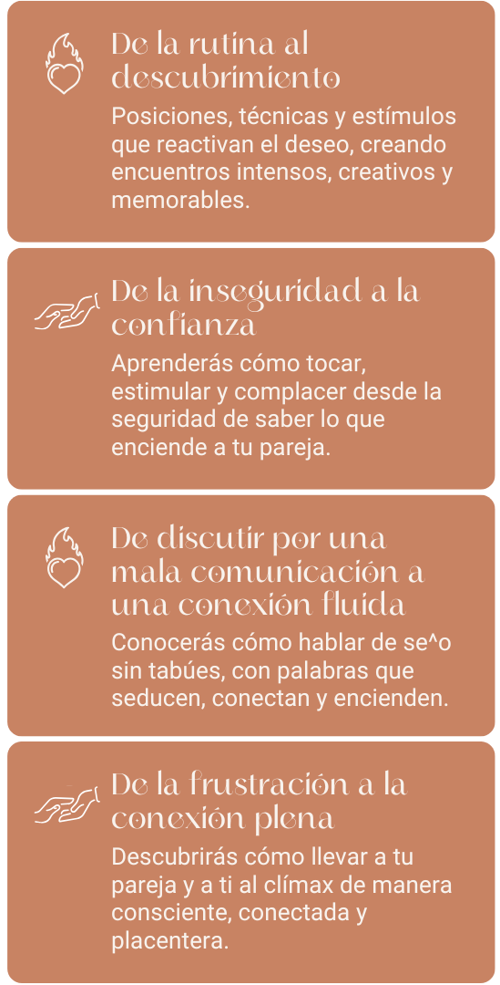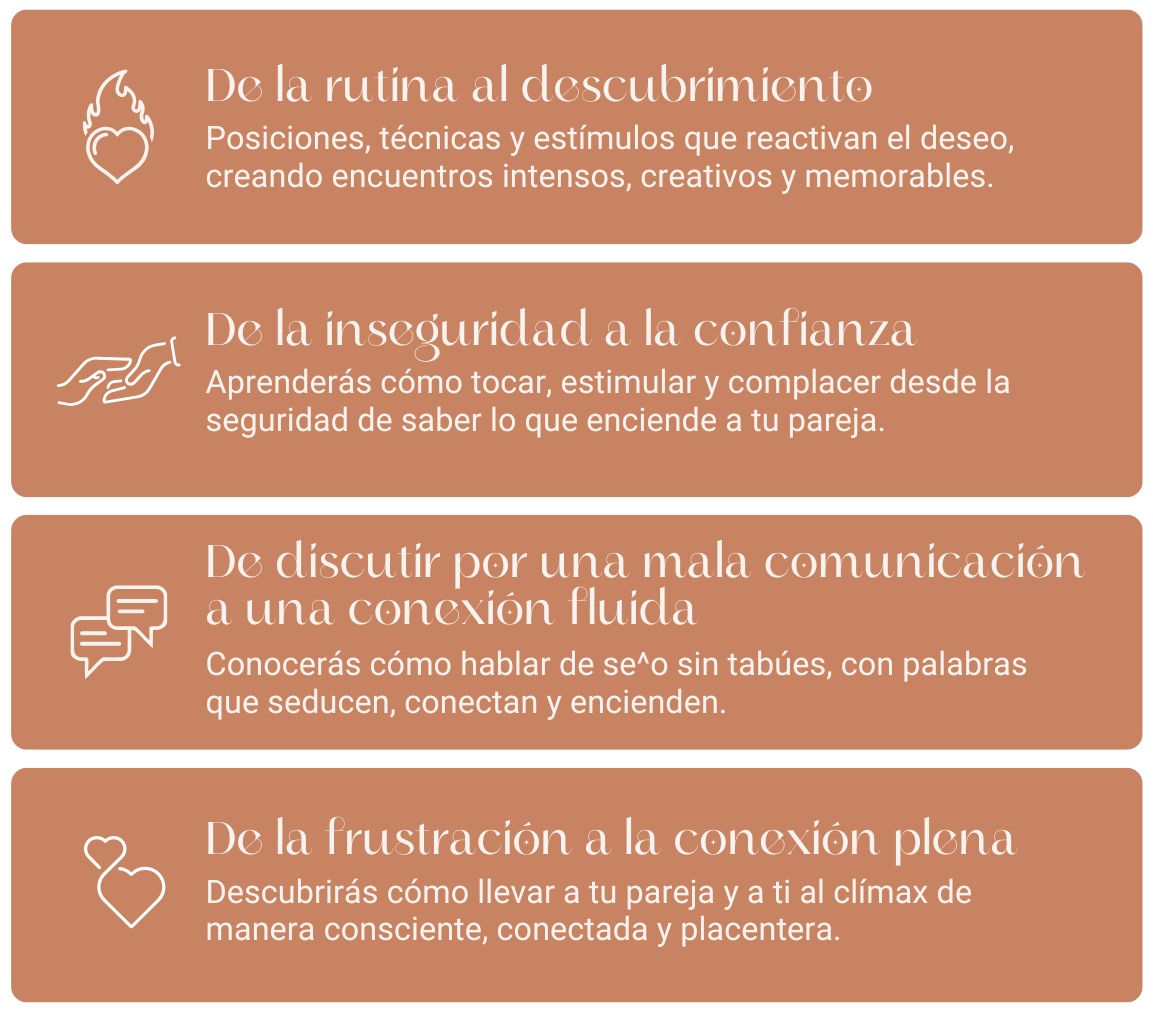 Mayor autoconocimiento, desbloqueo emocional, mejora en tu autoestima sexual, y herramientas para vivir tu placer con libertad y consciencia.